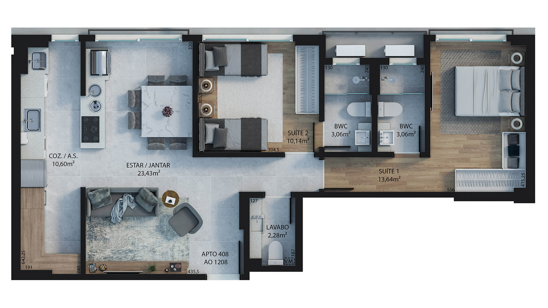 Apartamentos de 2 ou 3 dormitórios, sacada integrada, churrasqueira à gás e até 208m² de área privativa.