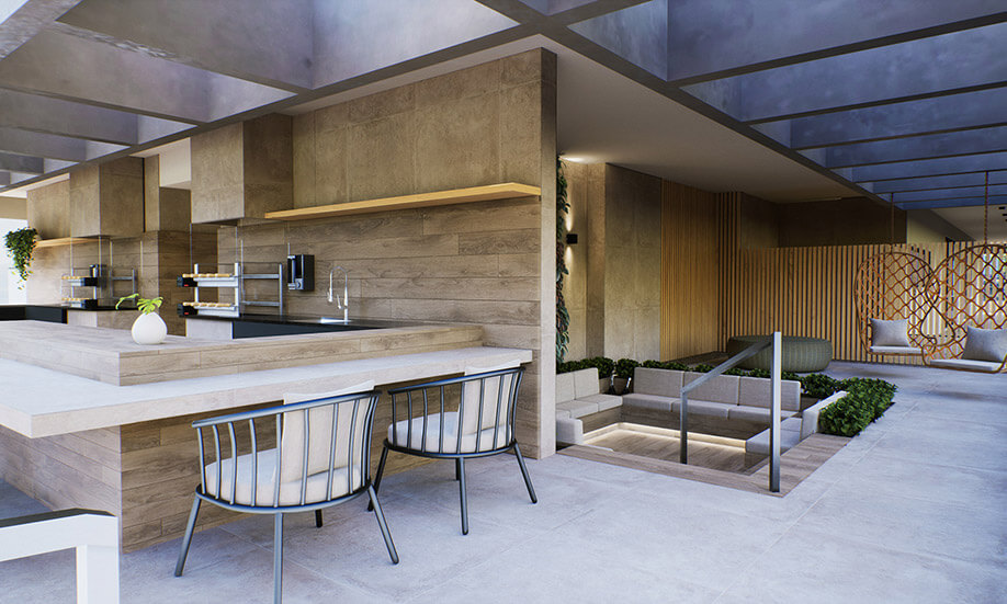 Espaços do térreo e rooftop planejados para momentos de lazer ou atividades do dia a dia.