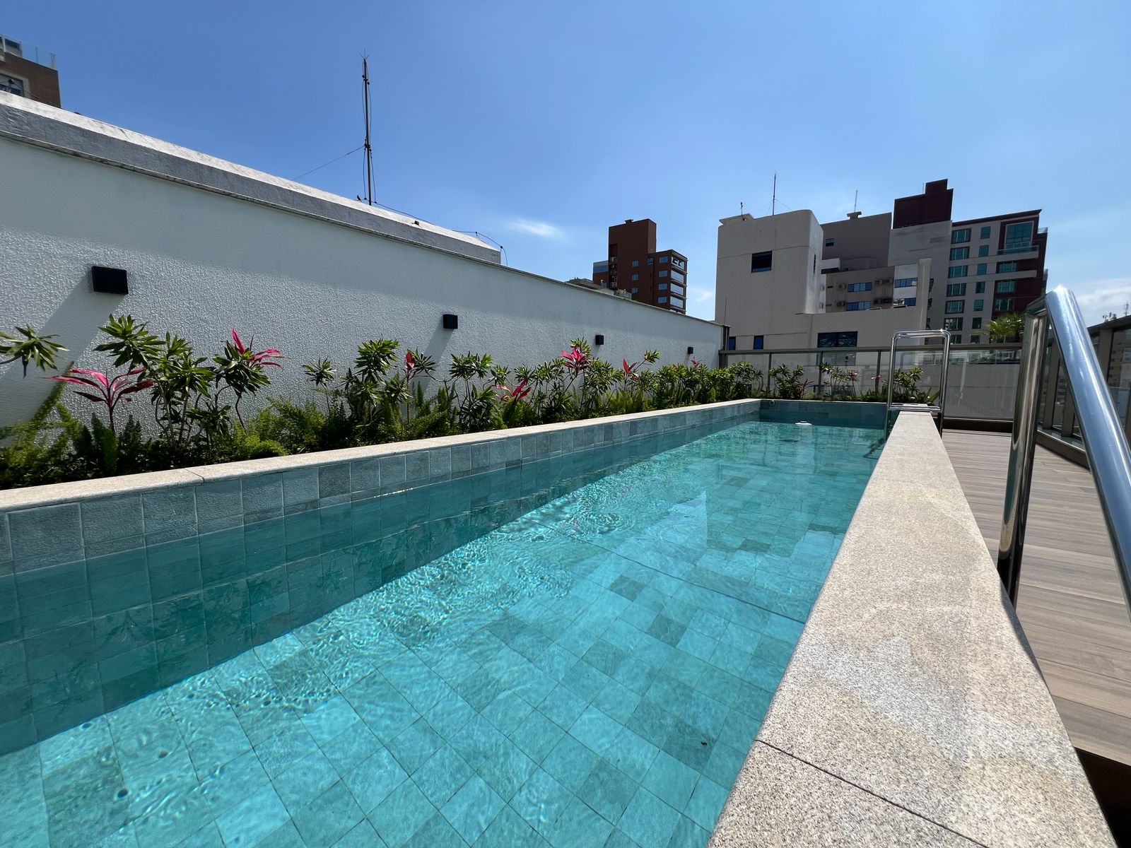 O condomínio conta com salão de festas e piscina na cobertura.