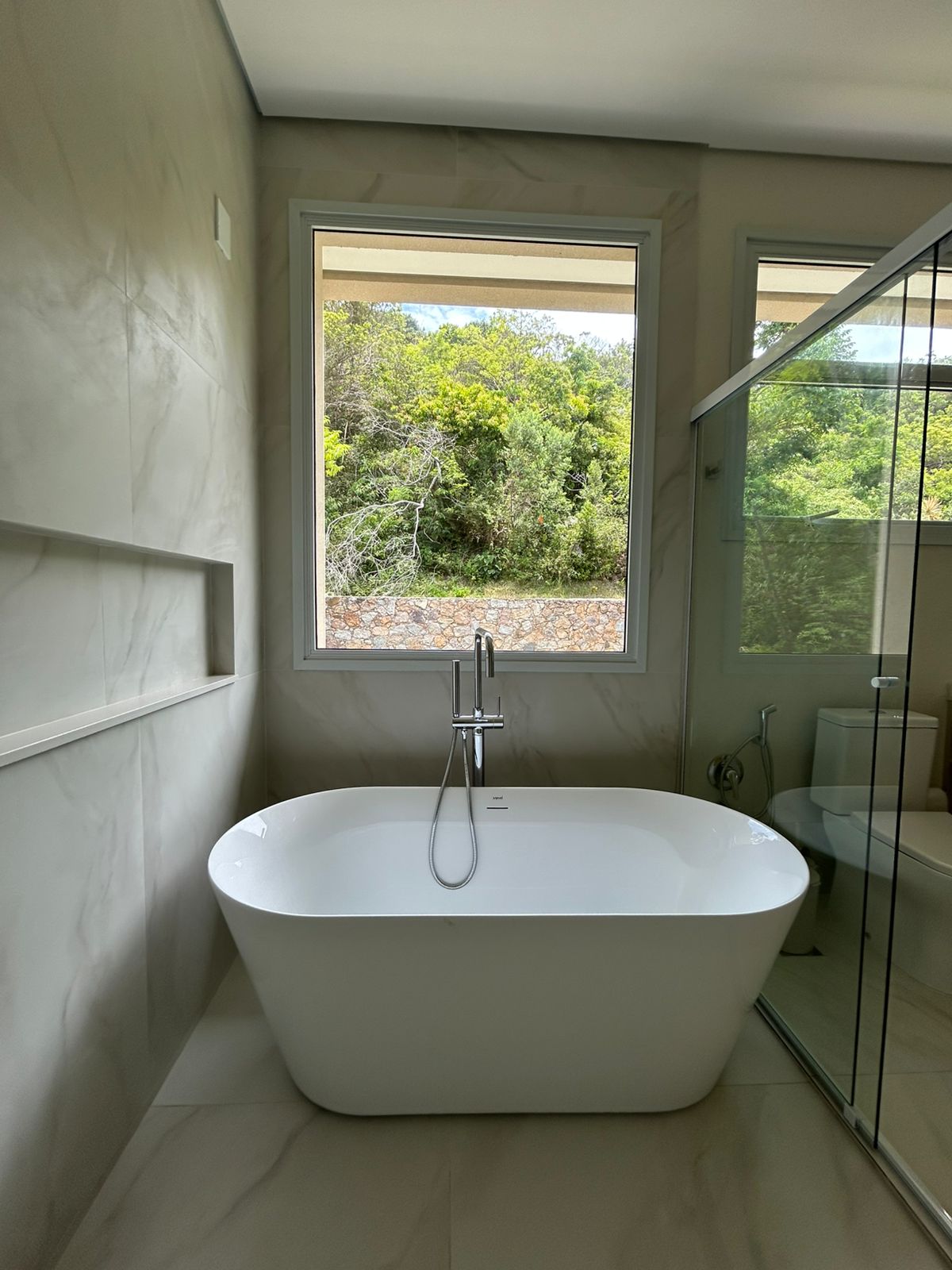 louças, metais, bancadas, aquecedor de passagem, ar-condicionado, TVs de tela grande e banheira de imersão na suíte master.